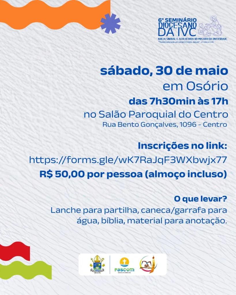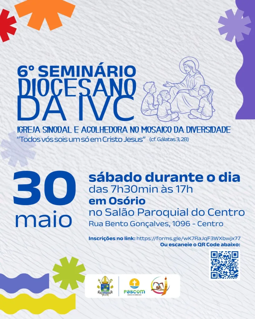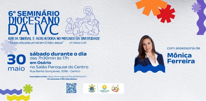 A Diocese de Osório já está em fase de mobilização para um dos principais momentos formativos do ano, com a realização do 6º Seminário Diocesano da Iniciação à Vida Cristã (IVC), que será realizado no dia 30 de maio, sábado, das 7h30 às 17h, no Salão Paroquial do Centro, em Osório. Com o tema “Igreja Sinodal e Acolhedora no Mosaico da Diversidade” e o lema “Todos vós sois um só em Cristo Jesus” (Gl 3,28), o encontro propõe uma reflexão aprofundada sobre a vivência da fé em uma Igreja cada vez mais inclusiva e participativa.