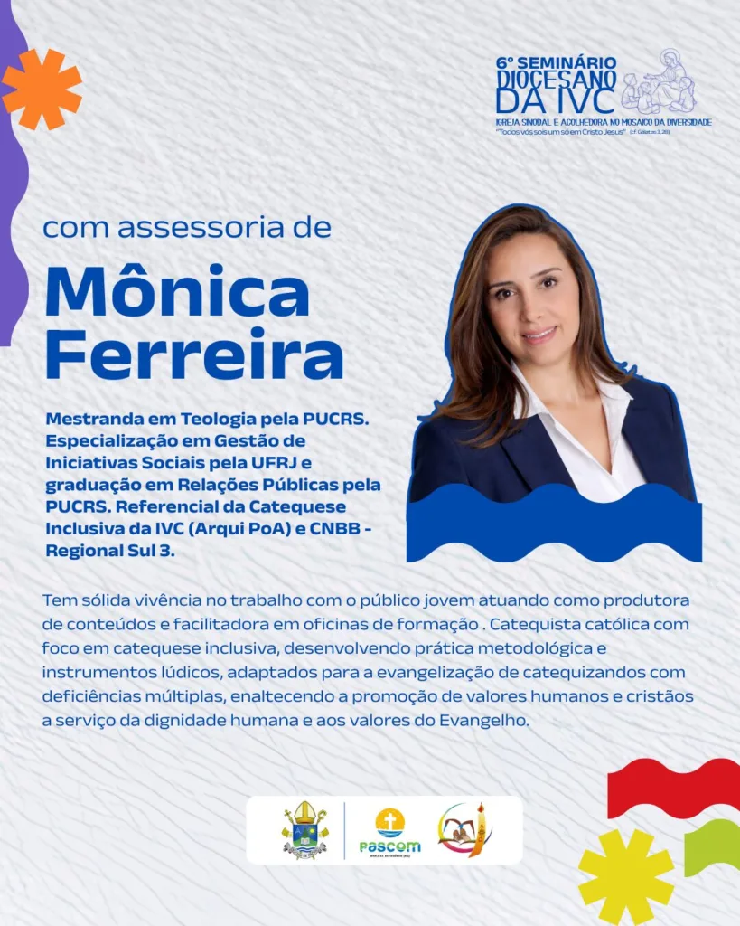 A assessoria será conduzida por Mônica Ferreira, mestranda em Teologia pela PUCRS, especialista em Gestão de Iniciativas Sociais pela UFRJ e graduada em Relações Públicas. Com atuação consolidada na catequese inclusiva junto à CNBB Regional Sul 3 e à Arquidiocese de Porto Alegre, Mônica traz uma trajetória marcada pela formação de agentes pastorais, especialmente no trabalho com catequizandos com deficiências múltiplas, aliando metodologia, sensibilidade pastoral e compromisso com a dignidade humana.