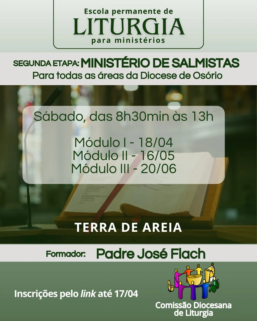 A Diocese de Osório, por meio da Comissão Diocesana de Liturgia, dará início, neste sábado (18), à Escola Permanente de Liturgia para Ministérios, etapa voltada ao Ministério de Salmistas. A formação será realizada na Paróquia São Pedro, no município de Terra de Areia, em consonância com o Plano Diocesano de Pastoral da Diocese.