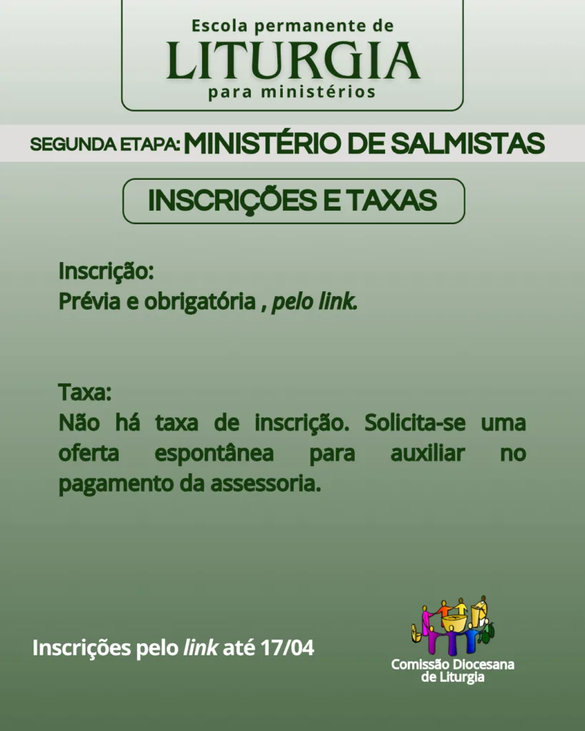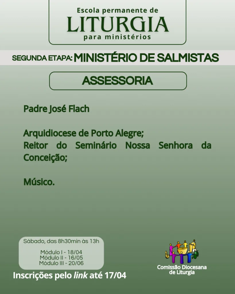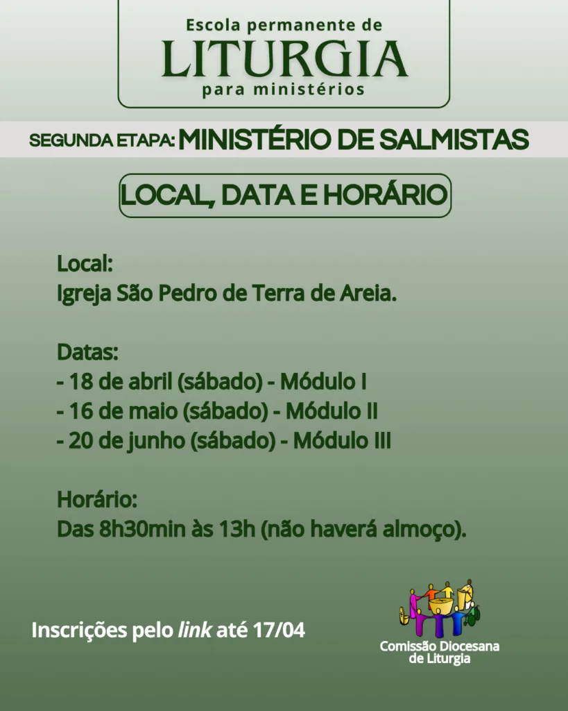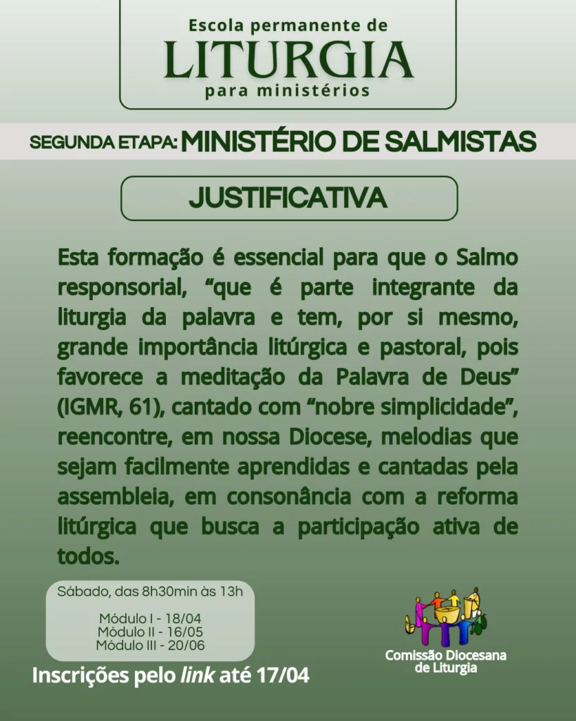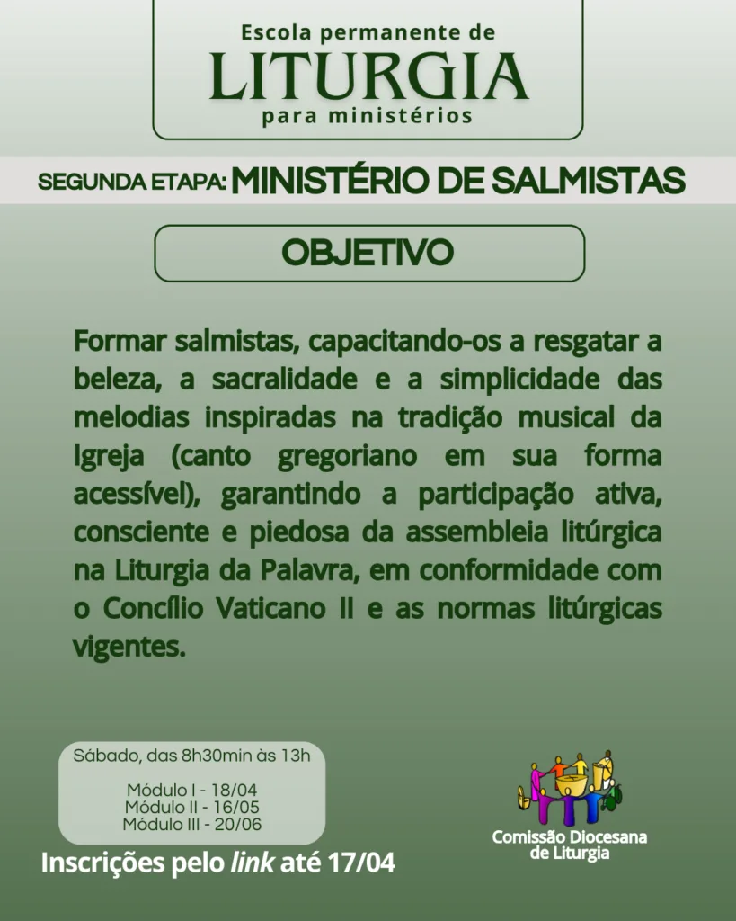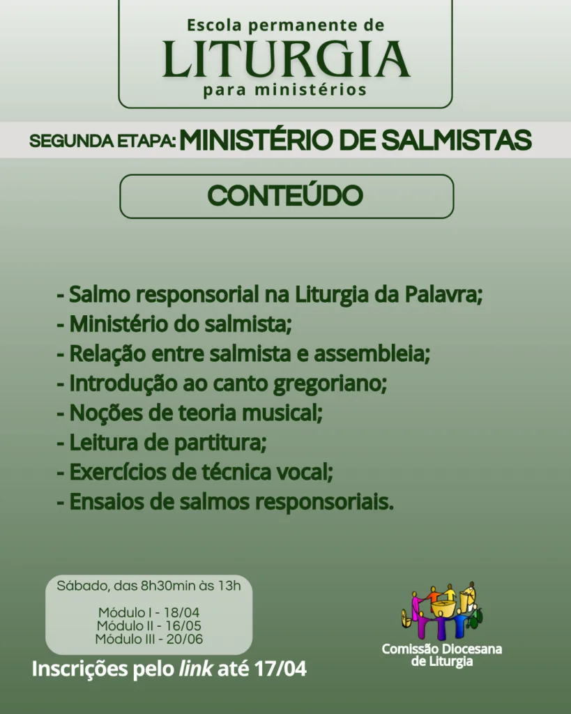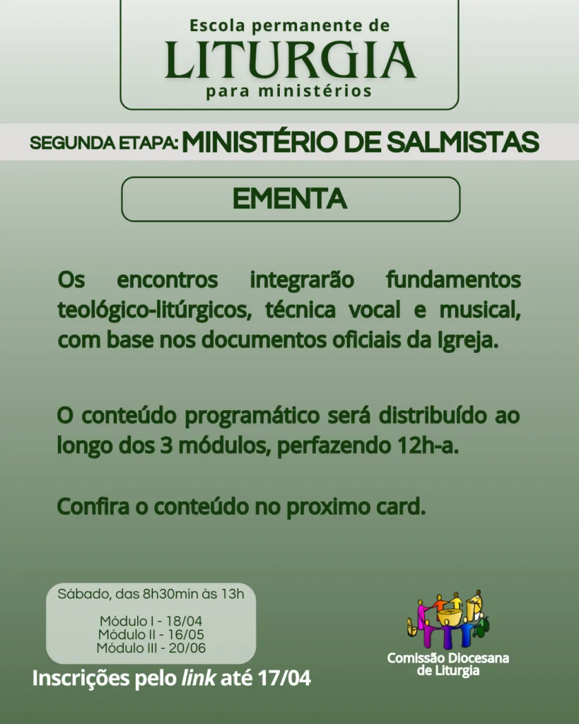 A formação é direcionada tanto a salmistas que já exercem o ministério quanto àqueles que desejam iniciar o aprendizado da salmodia. O percurso formativo será estruturado em três módulos mensais, com encontros aos sábados, das 8h30min às 13h, nas seguintes datas: 18 de abril, 16 de maio e 20 de junho.