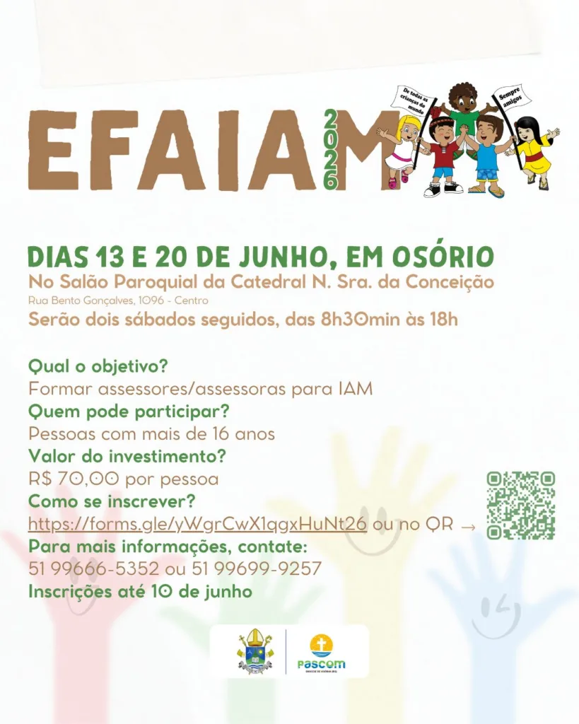 A Diocese de Osório promove, nos dias 13 e 20 de junho, o EFAIAM 2026 – Encontro de Formação de Assessores/as da Infância e Adolescência Missionária. A iniciativa será realizada em dois sábados consecutivos, no Salão Paroquial da Paróquia Nossa Senhora da Conceição, no Centro de Osório, com início às 8h30min e encerramento às 18h em ambos os dias.