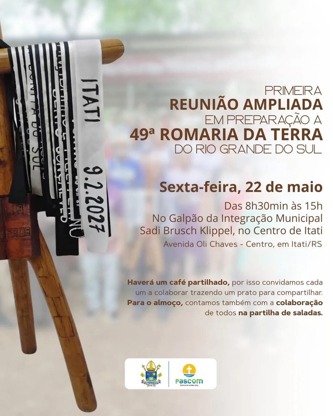 A Diocese de Osório promove, no dia 22 de maio, sexta-feira, a primeira reunião ampliada em preparação à 49ª Romaria da Terra do Rio Grande do Sul, que ocorrerá no dia 09 de fevereiro de 2027, na Paróquia Imaculada Conceição, em Itati. A reunião ocorre das 8h30min às 15h, no Galpão da Integração Municipal Sadi Brusch Klippel, na Avenida Oli Chaves, 100, no Centro de Itati, reunindo representantes das pastorais sociais, movimentos e lideranças comprometidas com a construção coletiva da Romaria.