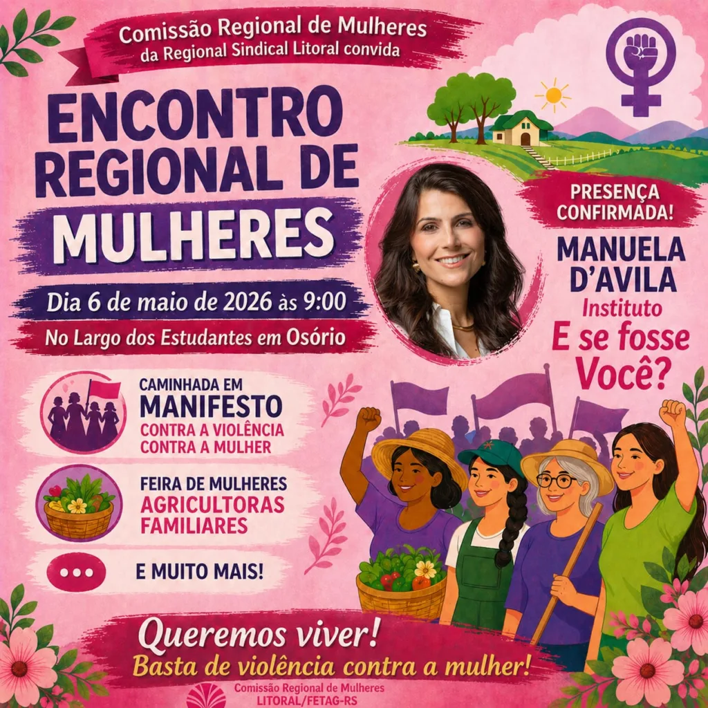 A Comissão Regional de Mulheres da Regional Sindical Litoral/FETAG-RS promove, no dia 6 de maio, o Encontro Regional de Mulheres, em Osório, com foco na mobilização social, no enfrentamento à violência de gênero e na valorização da agricultura familiar. A programação inicia às 9h, no Largo dos Estudantes, no Centro, reunindo agricultoras, lideranças e comunidade em geral.
