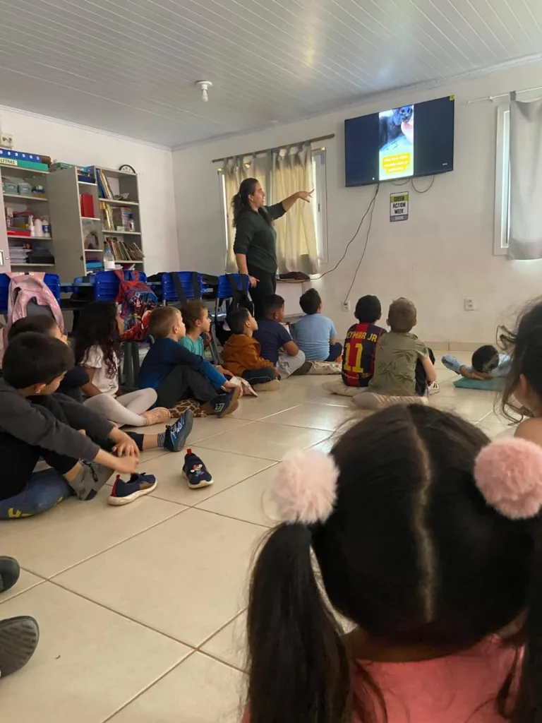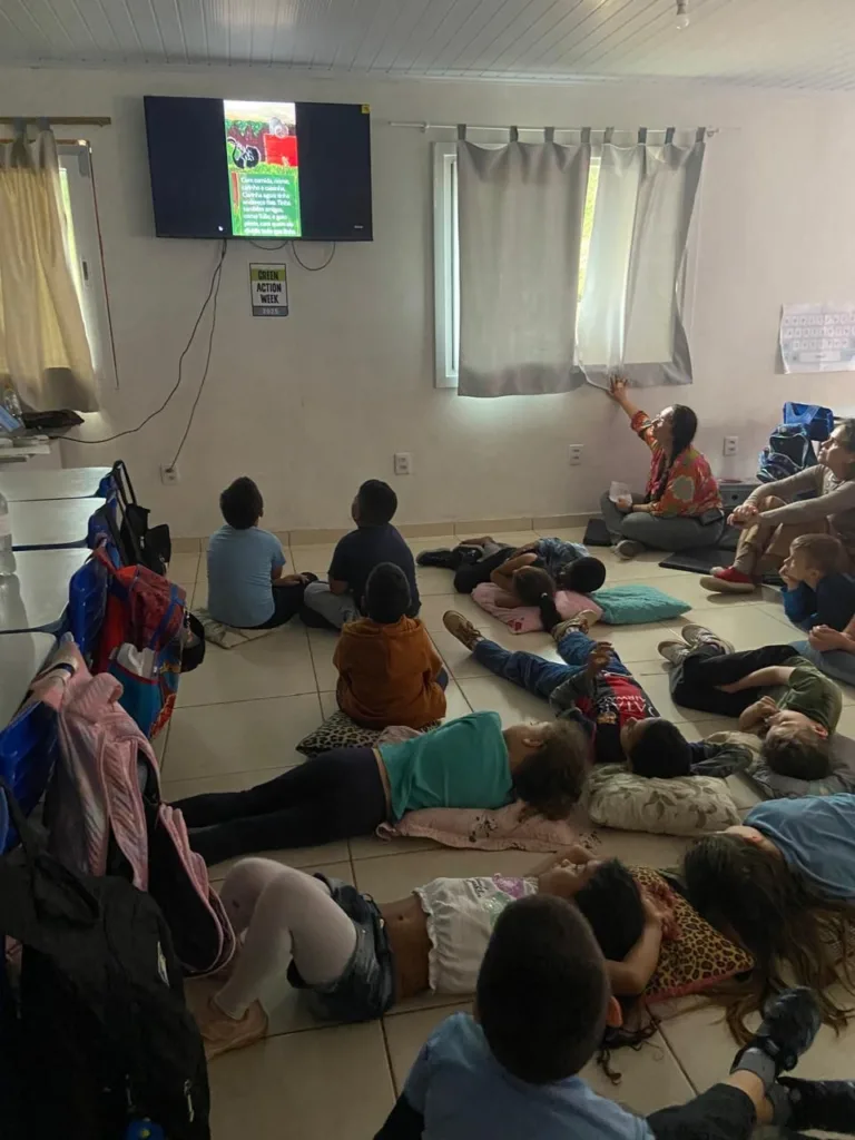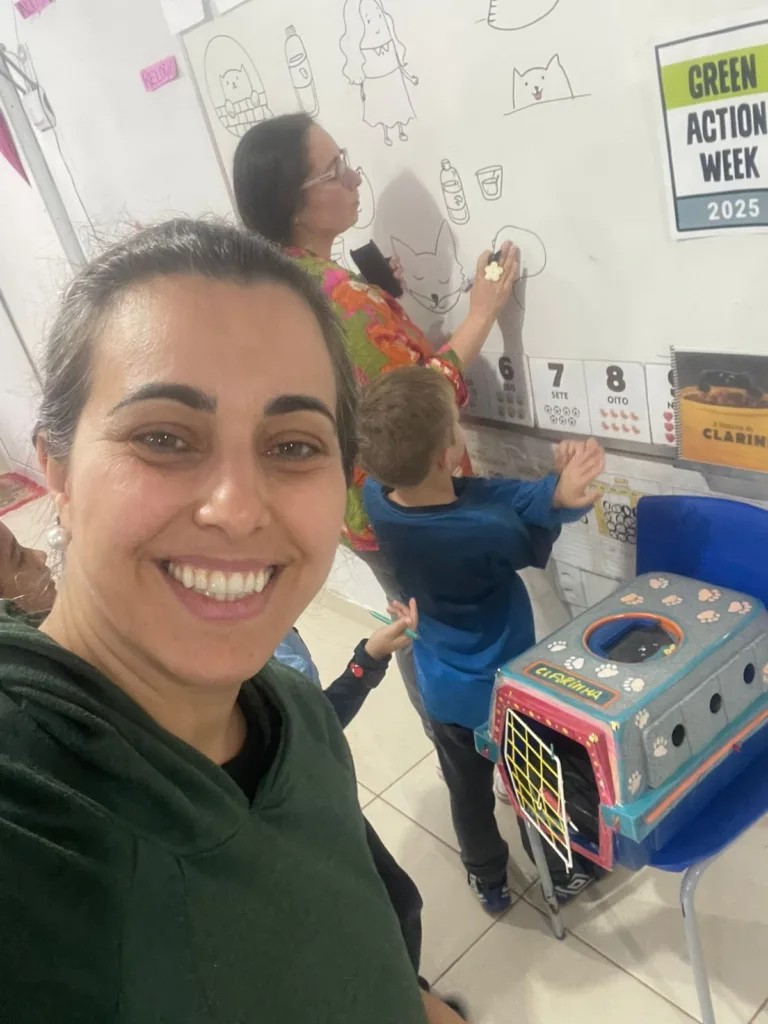 Seguindo o cronograma de atividades proposto pela professora Suelen Machado, as crianças assistiram a dois vídeos: um com vídeos e fotos da gatinha e outro com o livro ilustrado por Carol Salles, inspirado na história real da gatinha. Depois conversaram sobre cuidados com os animais, a complexidade dos sentimentos humanos e a cor da gata, entre outros temas que emergiram das histórias.
