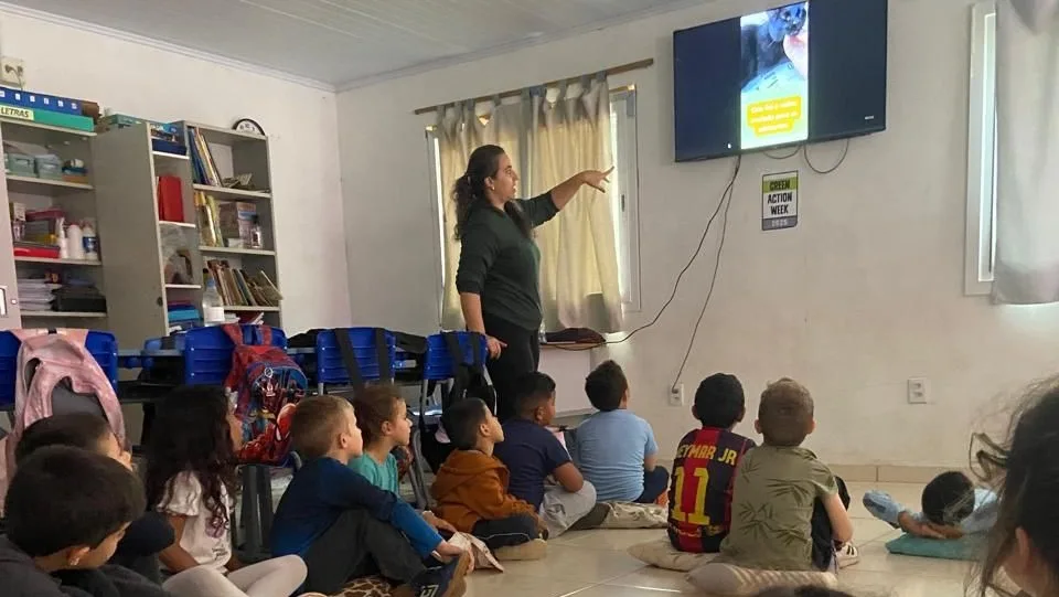 A quatro dias do Dia dos Animais, o 1º ano da Escola Estadual de Ensino Fundamental Dom José Baréa, na comunidade de Santo Anjo da Guarda, em Três Cachoeiras, recebeu na tarde de terça-feira a história de uma gata preta chamada Clarinha. A atividade organizada pelo Centro Ecológico em parceria com a Escola Estadual Dom José Baréa e a Associação Torrense de Proteção aos Animais (ATPA) integrou uma campanha internacional chamada Green Action Week (GAW, Semana da Ação Verde).