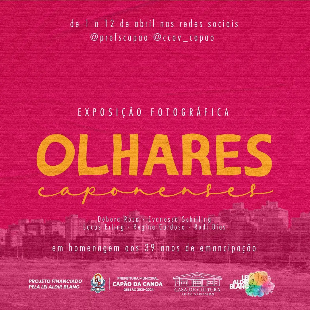 No próximo dia 12 de abril, o município de Capão da Canoa completa 39 anos de emancipação político-administrativa, e para comemorar a data, a prefeitura municipal por meio do Departamento de Cultura órgão vinculado à Secretaria de Turismo, Indústria e Comércio, promove a exposição fotográfica “Olhares Caponenses”. A exposição on-line inicia nesta quinta-feira (1º) e vai até o dia 12 de abril. As fotos serão divulgadas nas redes sociais da prefeitura e da Casa de Cultura Érico Veríssimo.